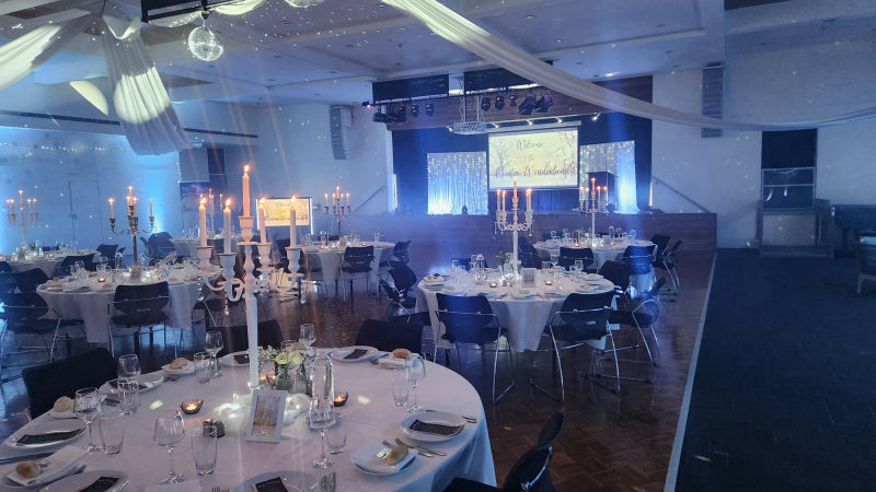 A video monogram is a personalised visual element that can be projected onto our front screen. This could include the couple's initials, event logo, or other customised graphics.